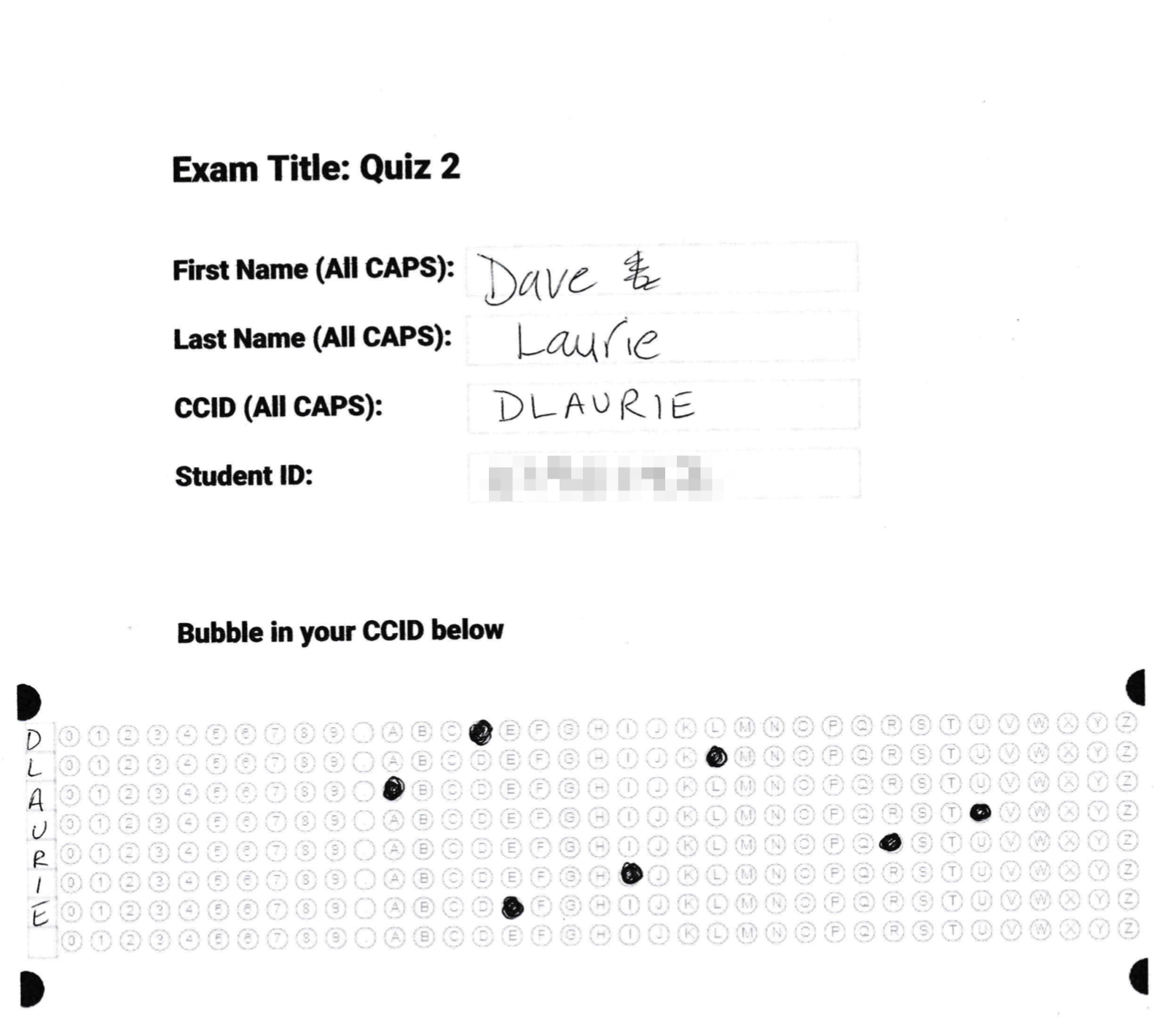 Once printed, these exams would now be given to students in-class who will fill in their name, and student ID number on their copy and complete their assessment: