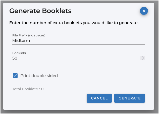 On the ‘Generate Exams’ overlay, specify a file prefix and enter the number of exams required for printing, then click Generate: