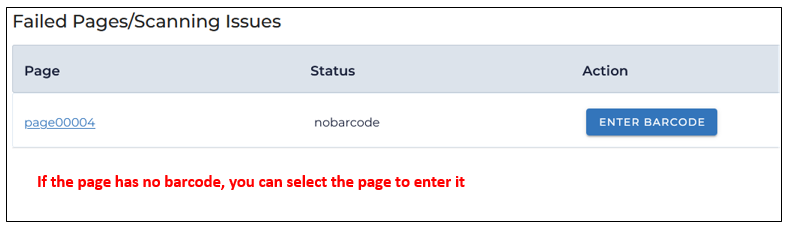 If a barcode is missing or obscured you can view the page by clicking its link, and enter the barcode by clicking Enter Barcode: